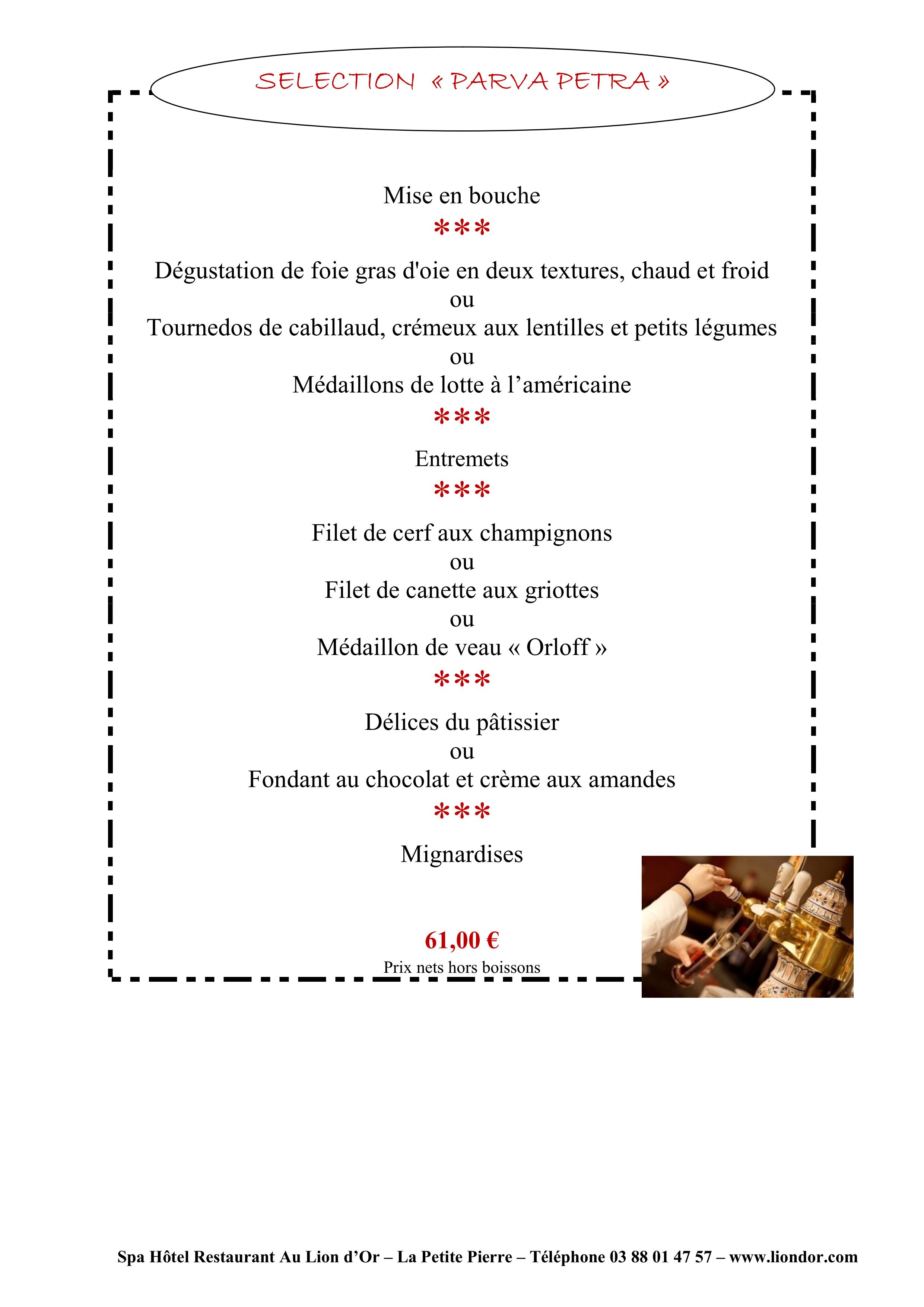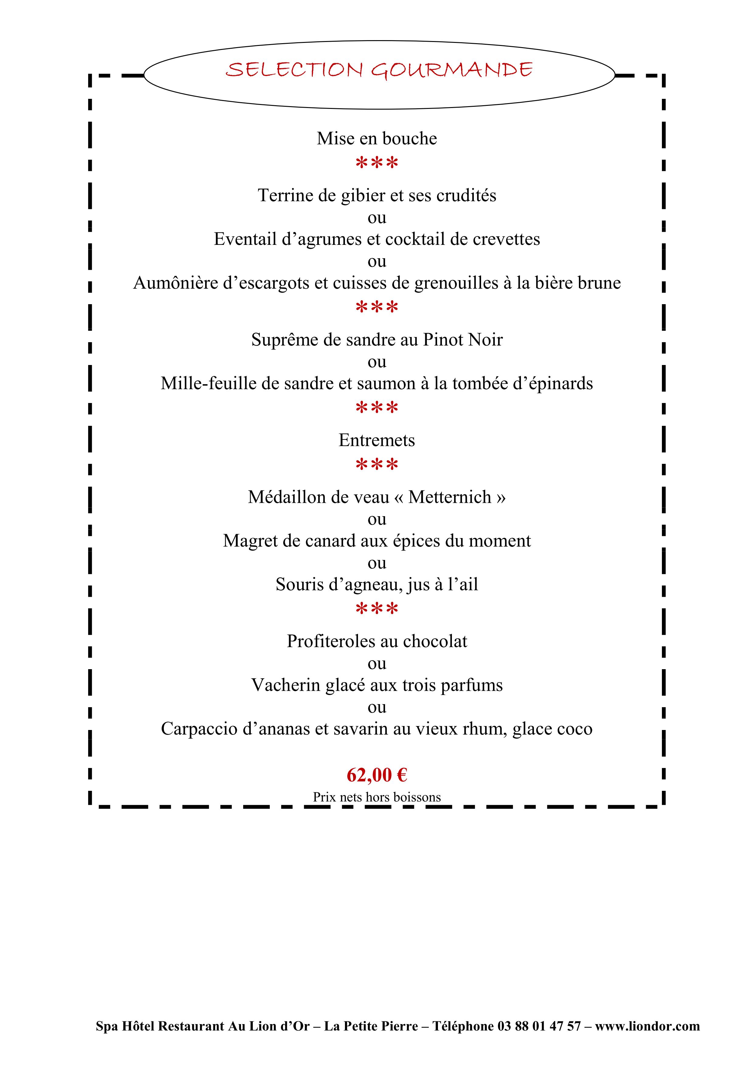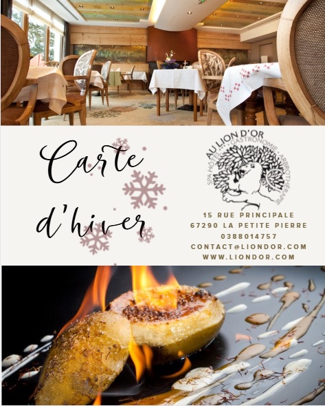 C'est une cuisine subtile, raffinée et de qualité faisant la part belle aux produits du terroir qui vous sera servie dans le cadre élégant de notre restaurant gastronomique. Ici, la vue exceptionnelle sur le château et la forêt vosgienne accompagnera divinement vos mets les plus délicats telle la caille désossée farcie au foie gras et ses pommes dauphines aux truffes ou son pavé de lieu jaune et ses gnocchis à la betterave. Des mets traditionnels célébrant les spécialités régionales alsaciennes vous sont également proposés. Vous ne résisterez pas au pâté en croûte du grand-père de votre hôte, aux bouchées à la reine et aux escargots à l'alsacienne...